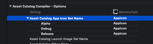 - target -> Build Settings -> All -> "assets"검색하여 "Asset Catalog Comiler - Options" 확인