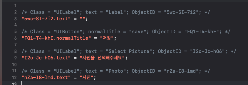 - 한국 Localization적용: storyboard는 객체의 키 = "값"으로 자동으로 설정되어 있으며, "값"부분에 채워넣으면 완료