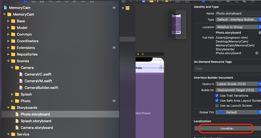- 지역화를 하고싶은 파일 .storyboard 클릭 -> Localize 클릭