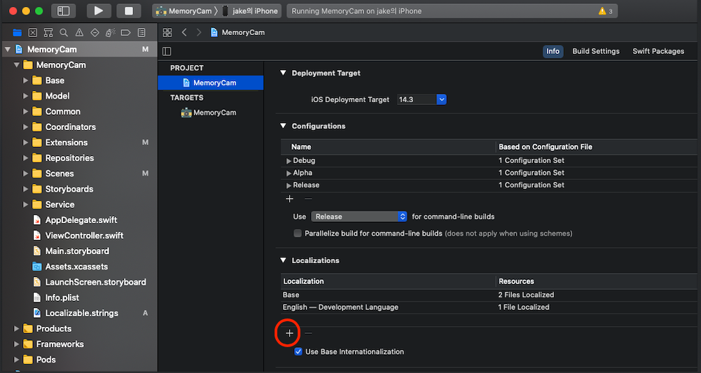 - Target -> Localizations에서 "+"버튼 클릭 -> 지역화를 하고싶은 나라 추가