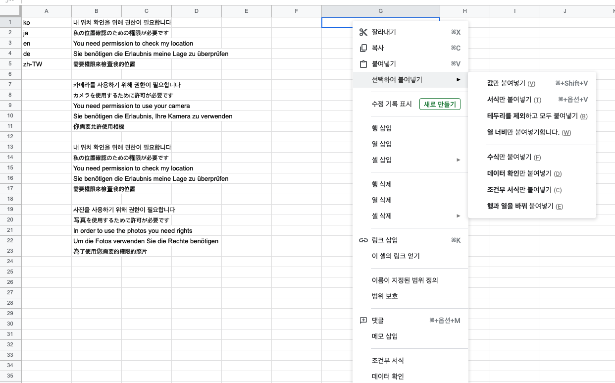 - 복사 후 오른쪽마우스 클릭 -> 값만 붙여넣기 (cmd + shift + V)
