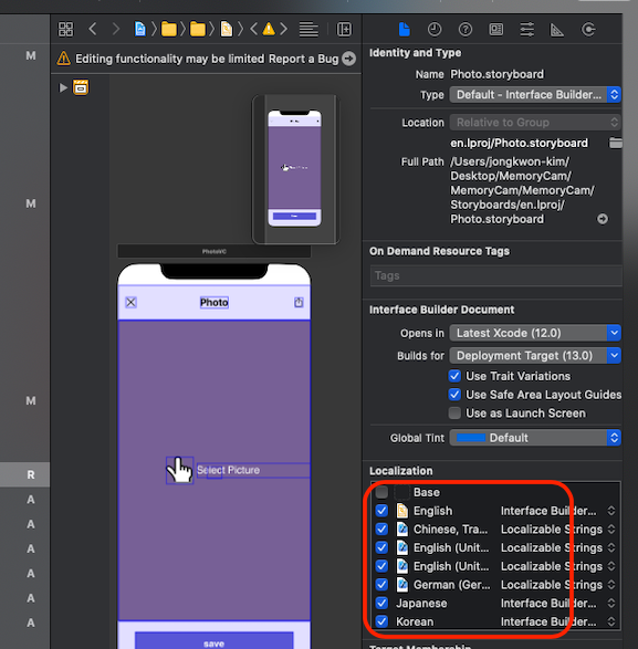 - 파일이 .strings가 아닌 ".storyboard"로 나오는 경우 -> 지역마다 storyboard를 커스텀할 수 있음