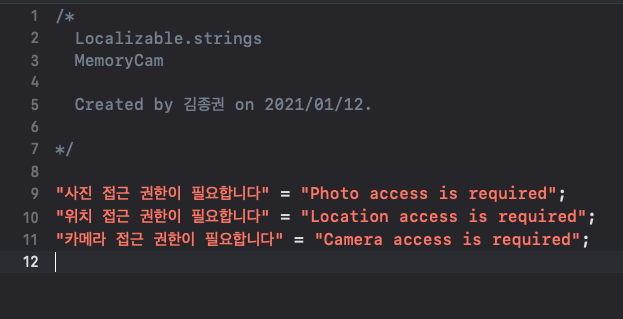 alertLabel.text = NSLocalizedString("\(title) 접근 권한이 필요합니다", comment: "") // 지역화 객체