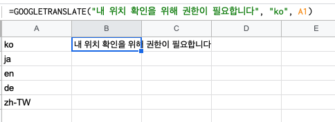 GOOGLETRANSLATE("번역할 문장", "ko", 첫 번째 셀 클릭하여 선택)