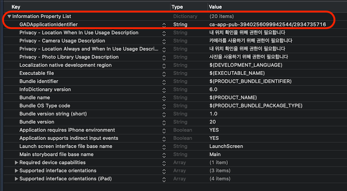 - info.plist 정보 세팅: key값은 "GADApplicationIdentifier", value값은 위에서 복사한 ID값으로 추가