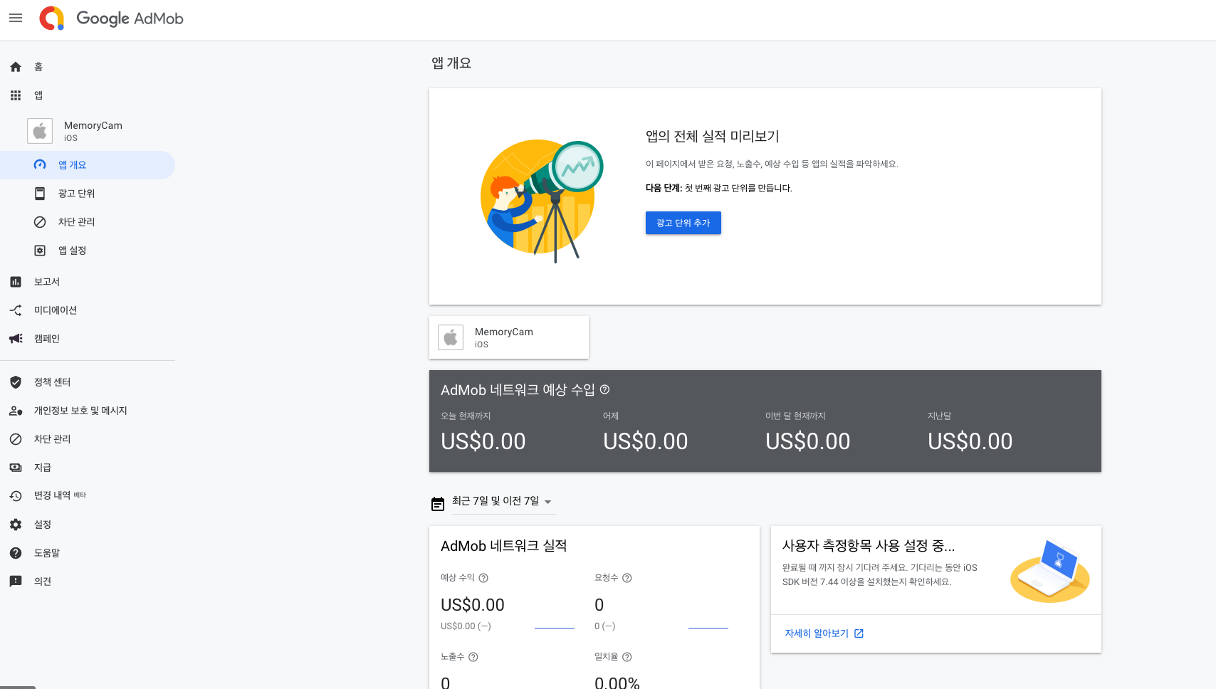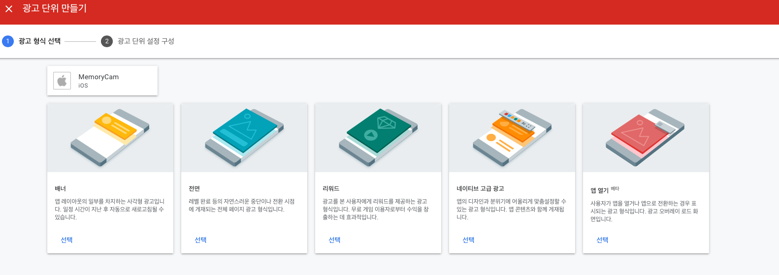 - 앱이 생성된 화면 -> "광고 단위 추가" 버튼 클릭