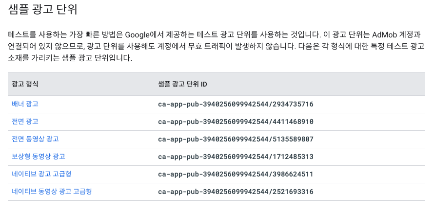 테스트를 위하면 "ca-app-pub-3940256099942544/2934735716" 키 사용