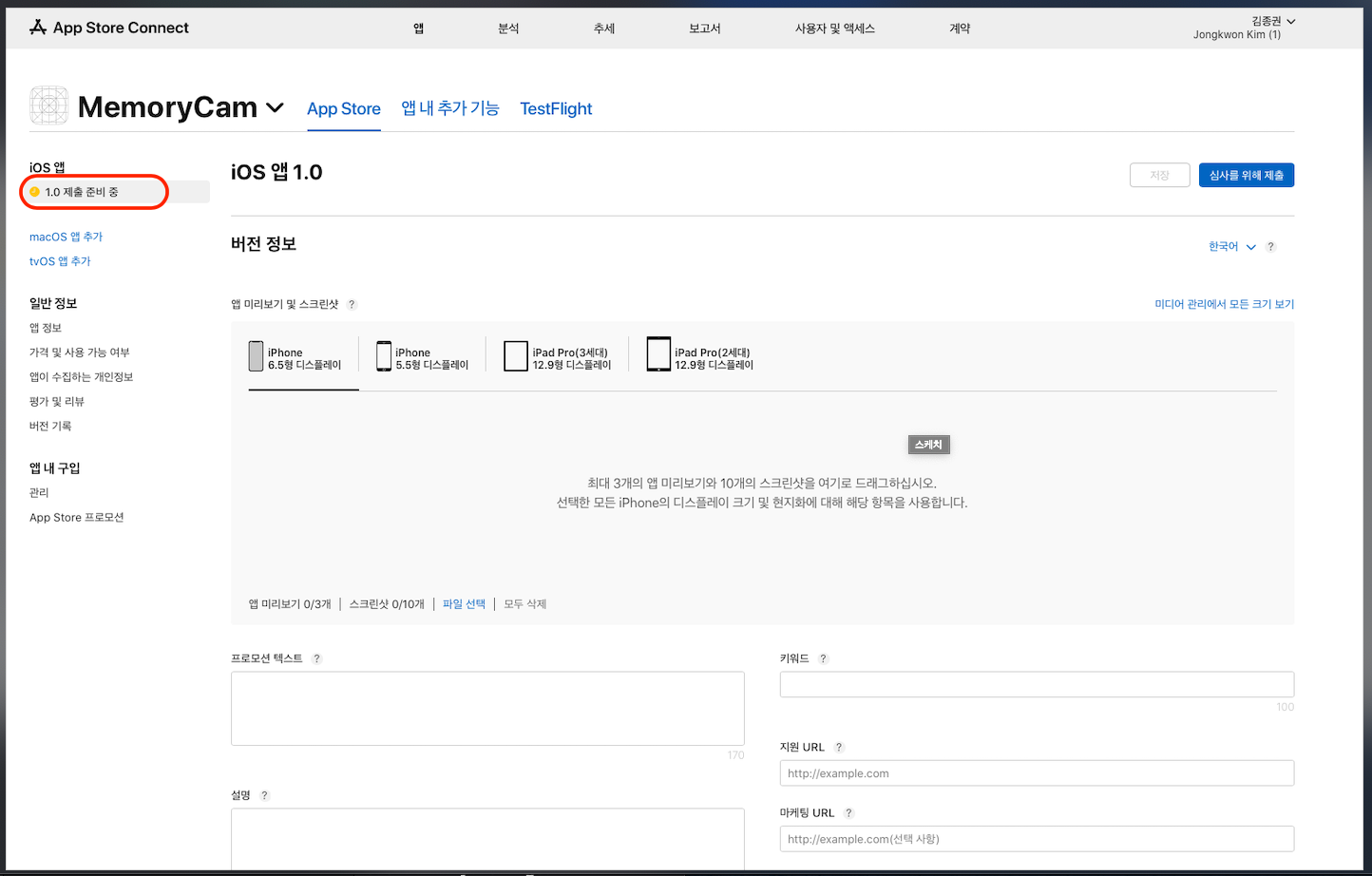 - 프로모션 텍스트, 설명, 키워드, 지원 URL, 마케팅 URL