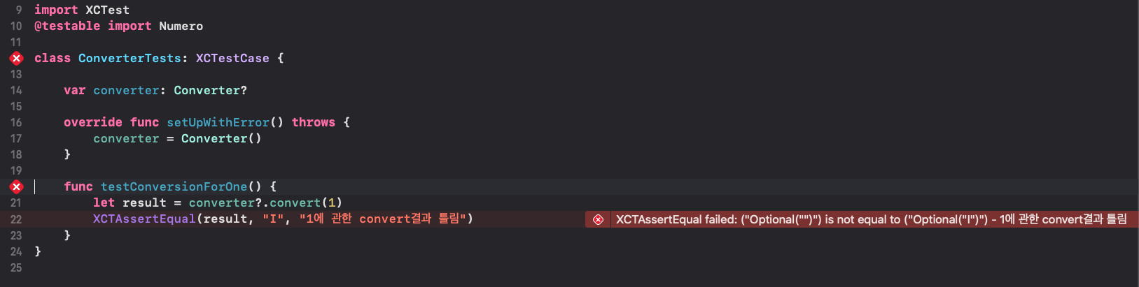 XCTAssertEqual(result, "I", "1에 관한 convert결과 틀림")