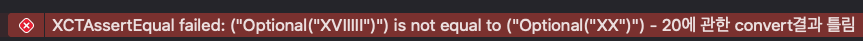 XCTAssertEqual(result, "XX", "20에 관한 convert결과 틀림")