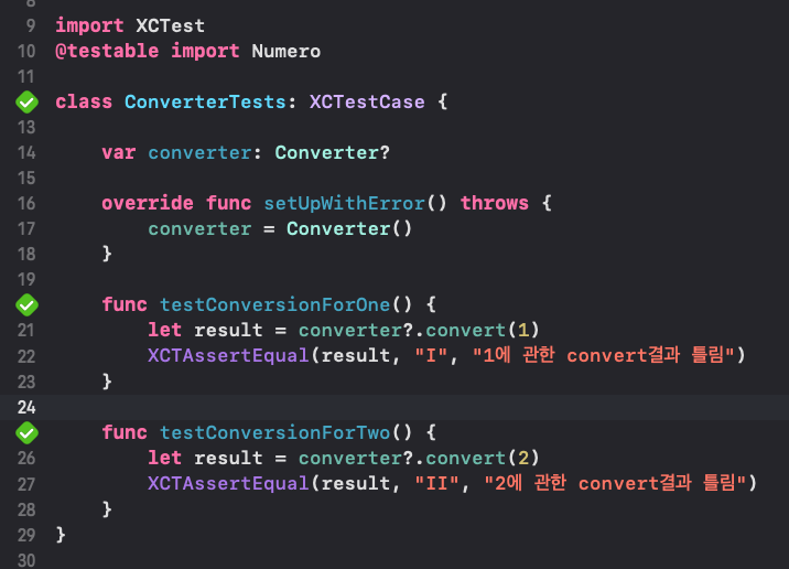 XCTAssertEqual(result, "II", "2에 관한 convert결과 틀림")