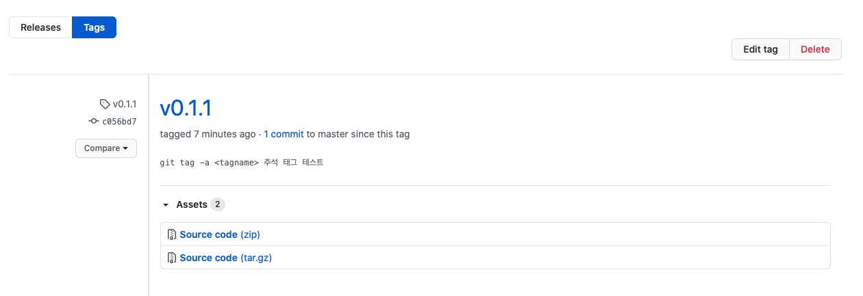 - tag를 작성하여 등록해놓으면 자동으로 Release정보가 아래처럼 생성