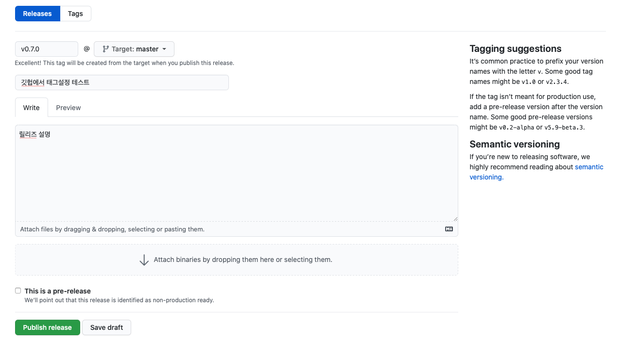 - Release 정보를 작성하고 싶은 경우 -> tag를 작성하여 관리