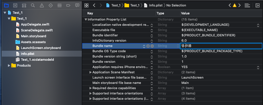 - info.plist -> Bundle name의 value속성에 이름 기입