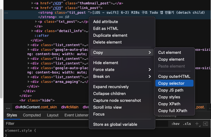 - 위에서 얻은 class path사용: "#mArticle > div:nth-child(7) > a.link_post > strong"