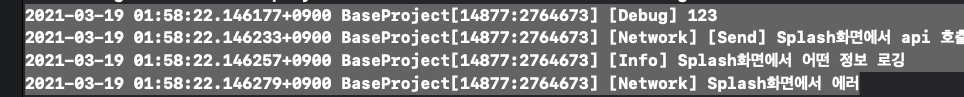 | Debug | x | 개발 환경에서의 간단한 로깅 (mac의 '콘솔'앱에는 찍히지 않고 xcode console에만 표출) |
