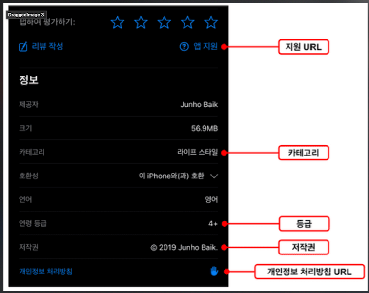 - 앱 스크린샷 이미지(iPhone 6.5형, iPhone 5.5형), 미리보기 동영상 (optional)