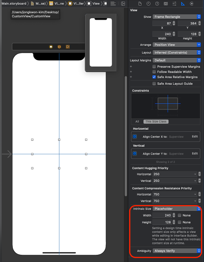 - intrinsic size를 지정하여 해결 (여기서 constraint를 주면 내부 크기에 따라 동적으로 뷰가 바뀌지 않고 고정)