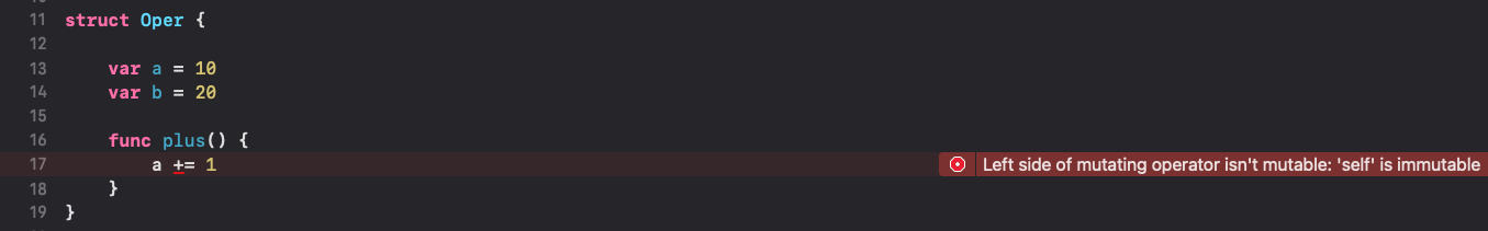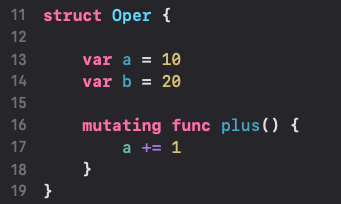 - struct에서 프로퍼티의 값을 변경할 땐, 프로퍼티가 var로 설정되어 있어도 mutating 키워드가 없으면 에러