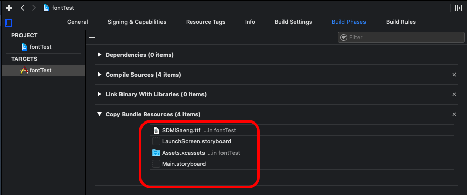 3) 프로젝트 정보창 -> Build Phases탭 -> Copy Bundle Resources에서 폰트 추가