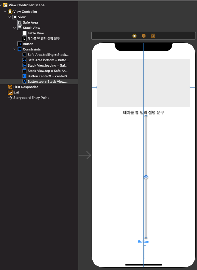- stackView의 bottom constraint는 button의 top에 greater than or equal 지정 - 주의: 아래처럼 stack view에 넣을 경우 경고 메세지가 뜰수 있으므로 주의