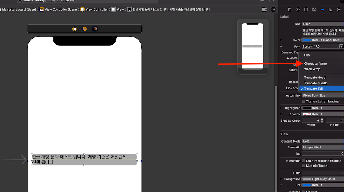 - Line Break를 Truncate Tail -> Character Wrap으로 변경 시 글자 단위로 변경