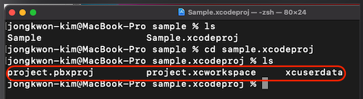 - 파일이 아닌 디렉토리임을 주의: 터미널을 통해 $ cd {프로젝트이름}.xcodeproj 하여 들어가게 되면,