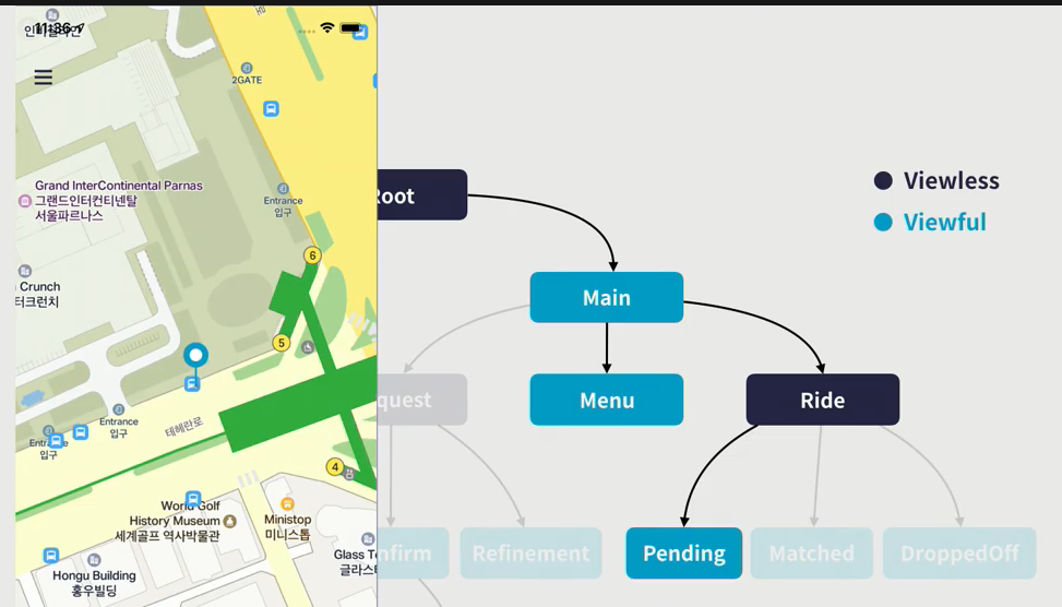 - riding 기능: 좌상단의 메뉴버튼이 있으므로, Ride RIB뿐만이 아닌 Menu RIB도 attach되어 있는 상태