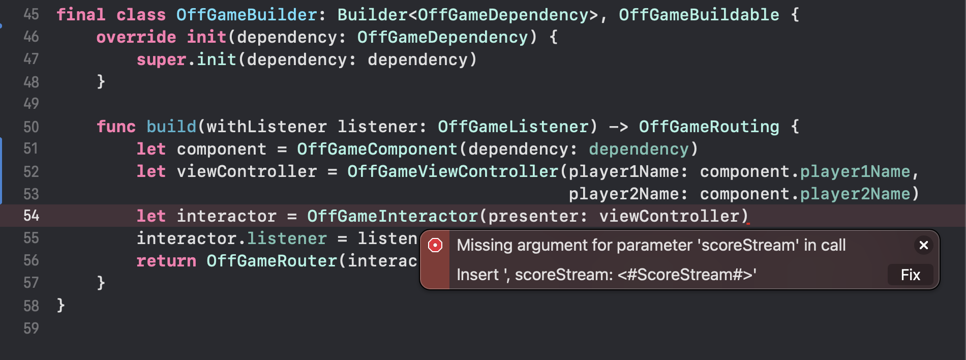 let interactor = OffGameInteractor(presenter: viewController, scoreStream: component.scoreStream) // <- scoreStream 초기화 추가