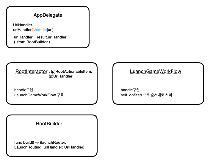 - AppDelegate에 프로토콜 선언 -> RootInteractor에서 프로토콜 구현 -> RootBuilder에서 build()함수의 리턴값에 urlHandler 추가