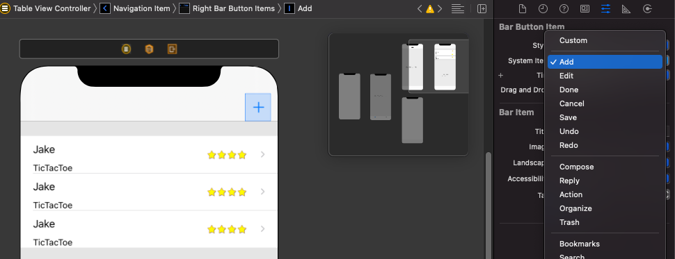 - Navigation Item에 Bar Button Item 추가