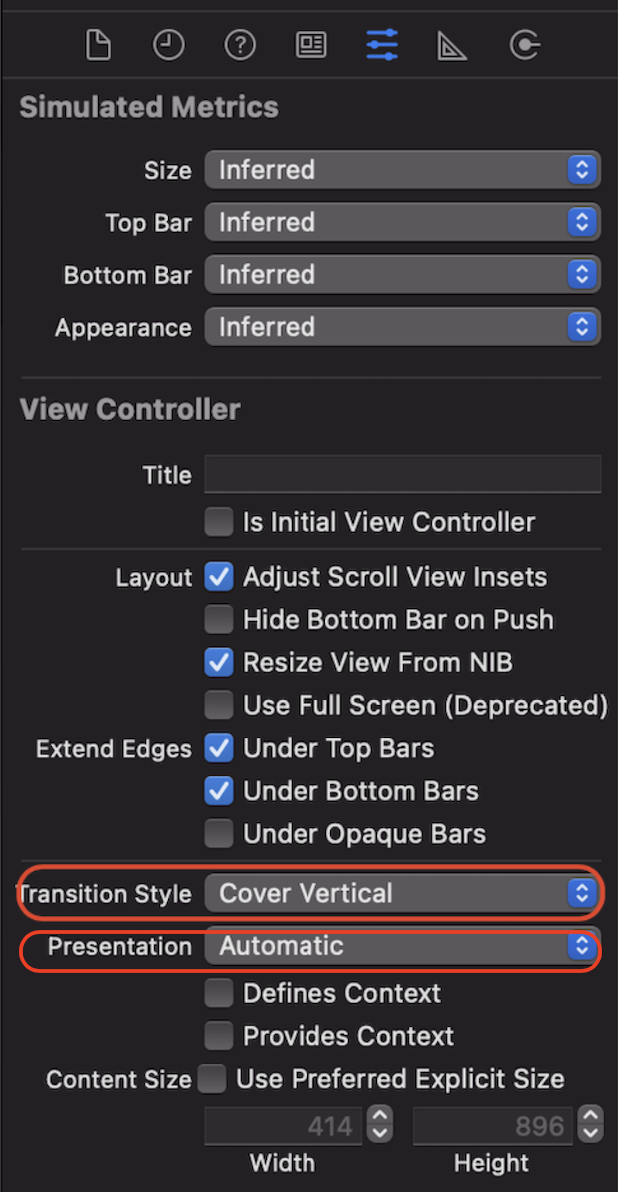 - 애니메이션 설정: 적용하려는 화면 ViewController 선택 > Transition Style, Presentation에서 설정