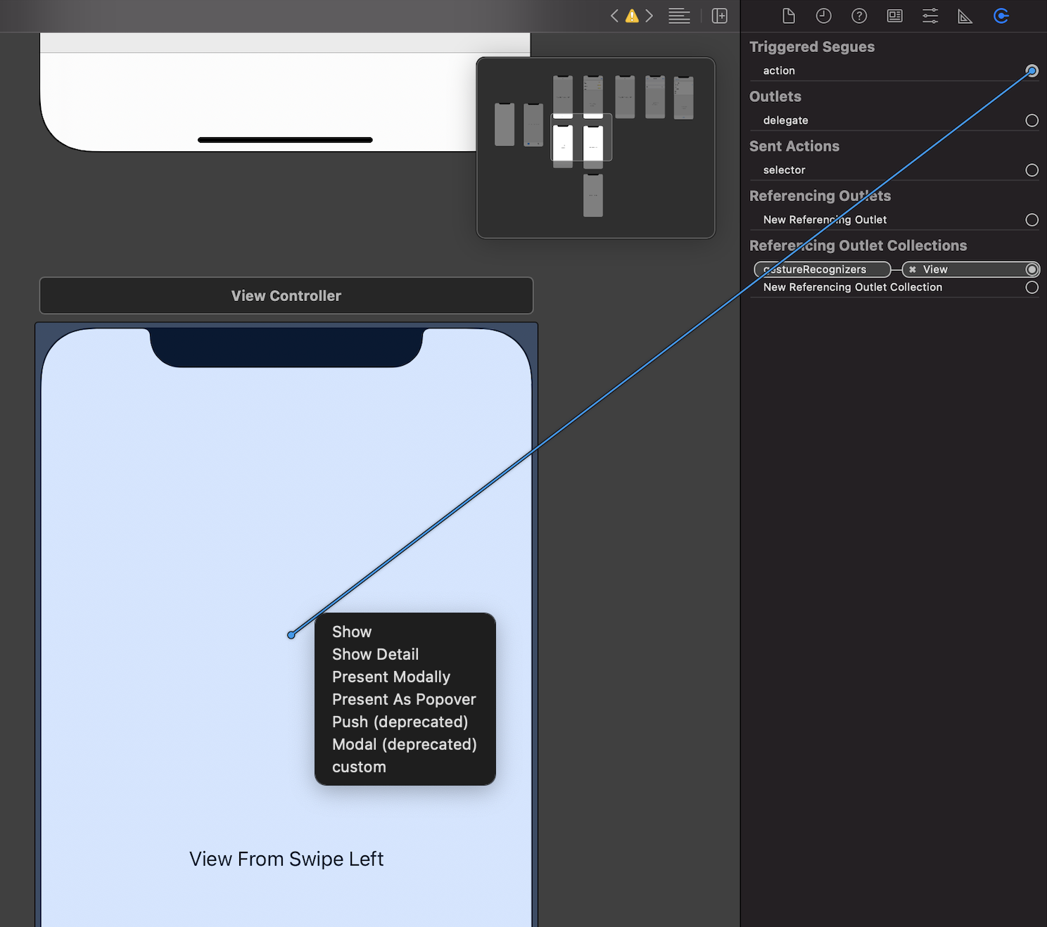 - Swipe gesture에서 segue 설정: Gesture 선택 -> Connection 탭에서 Segues 연결