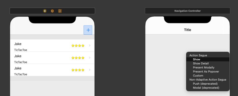 - 이 직전 화면의 plus Bar Button Item을 Ctrl+드래그 > segue > Show
