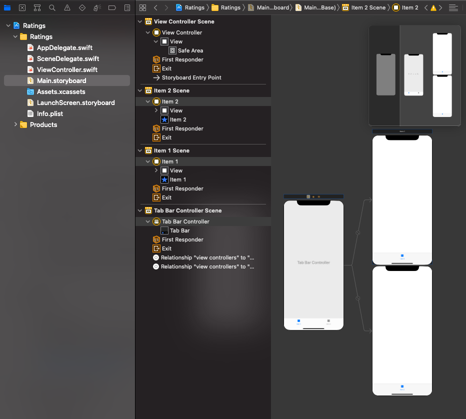 - TabBarController를 Ctrl+드래그 > Relationship segue > ViewControllers