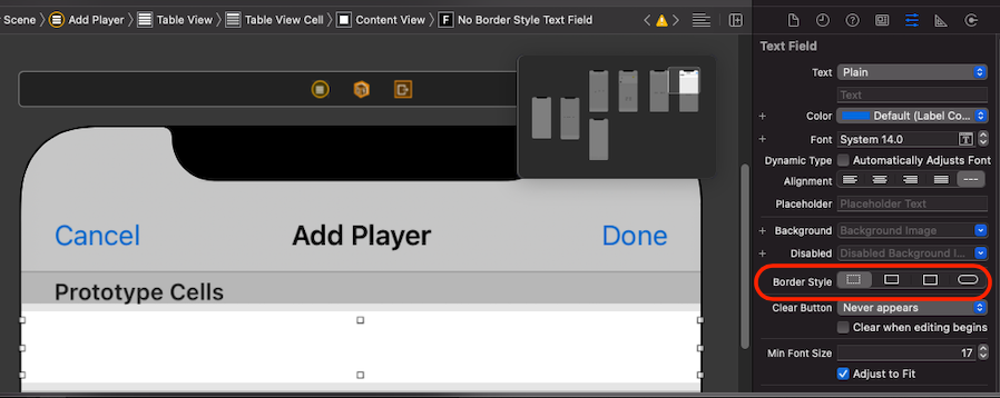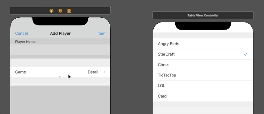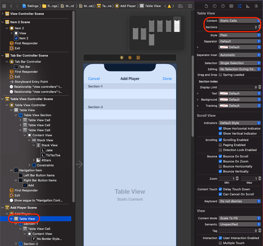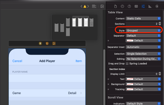 - Player Name과 Game은 하나의 group이므로, TableView의 Style을 Grouped으로 설정