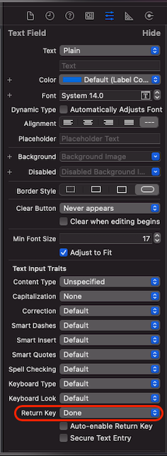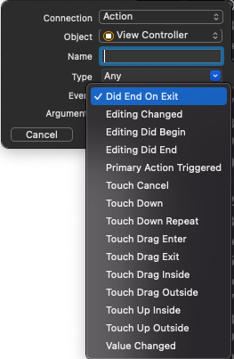 - @IBAction에서 "Did End On Exit"으로 처리: 해당 @IBAction이 연결되는 순간, return키나 done키가 눌리면 keyboard가 resignFirstResponder되는 기능도 자동으로 처리