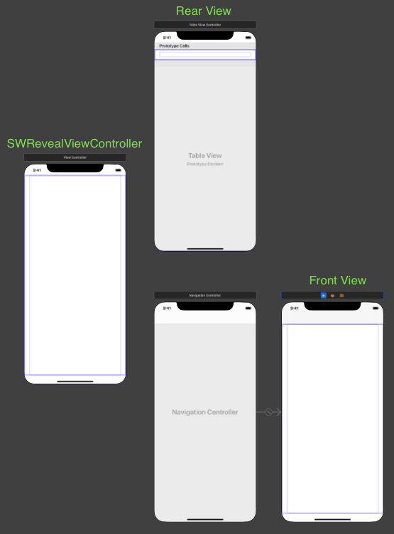 3) SWRevealViewController에서 Rear View로 Segue, "reveal view controller set controller"선택