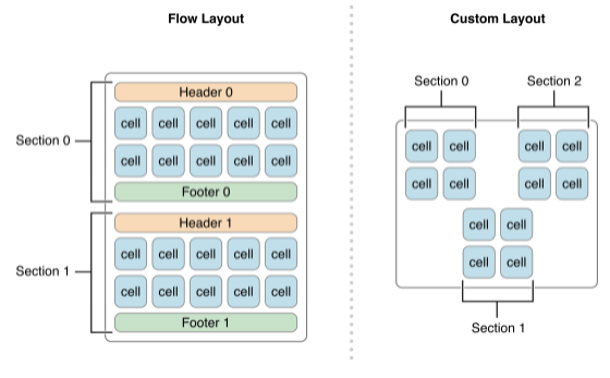 - 디폴트로 제공되는 레이아웃: UICollectionViewFlowLayout (선형 경로에 배치하고 최대한 행을 따라 많은 셀을 채우는 것)