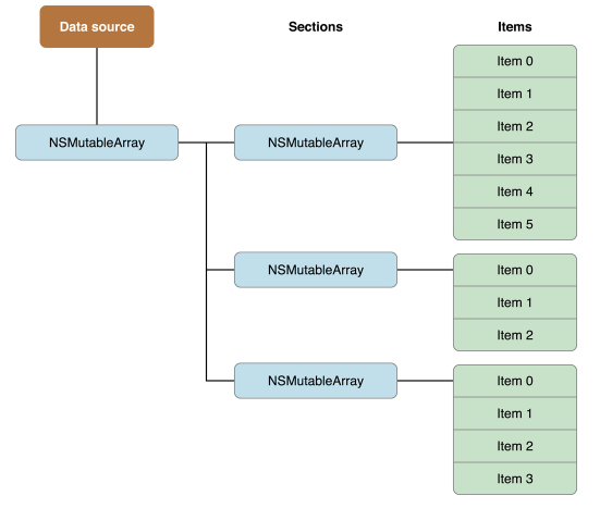- DataSource는 배열 하나를 가지고 있고, 이 배열안에는 Section별 배열이 존재하며, 이 section에는 item이 존재
