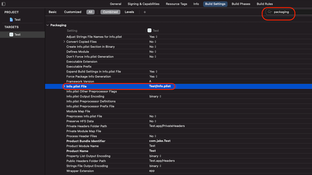 - info.plis File에 수정 준비: Target > Build Settings > Packaging