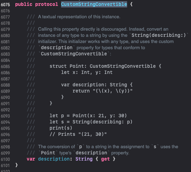 - 스위프트의 print()와 String(decription:)은 위 description 프로퍼티를 사용