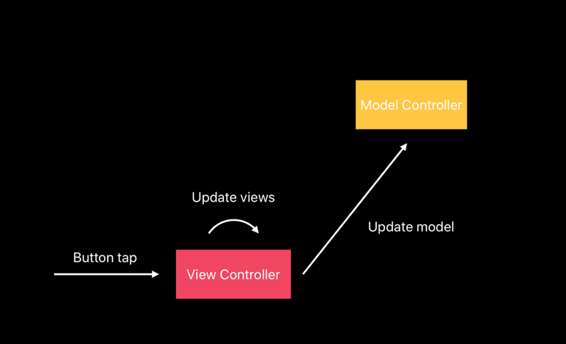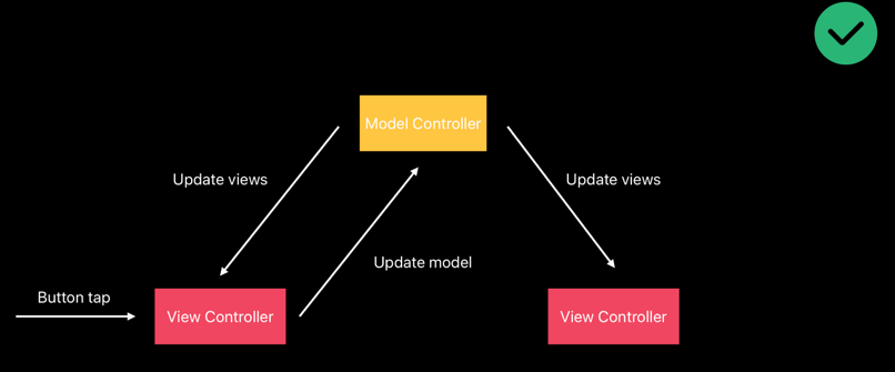 2) 현재의 방법 : view 변화 -> View Controller가 감지 -> Model에 알림 -> Model (Controller)가 다른 View Controller에게 알림