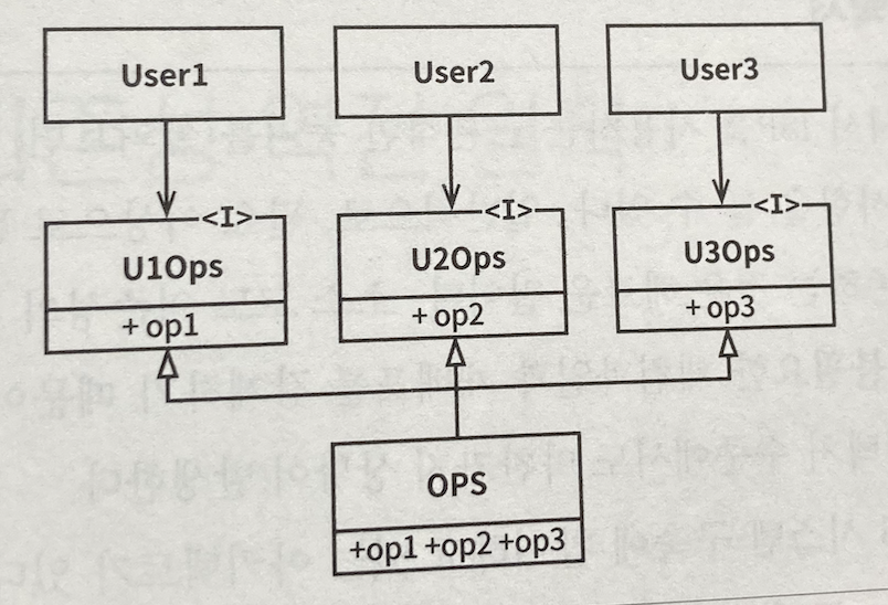 - ISP에 어긋난 구조: User1에서는 op2와 op3를 전혀 사용하지 않아도 User1의 소스 코드는 이 두 메서드에 의존하는 관계