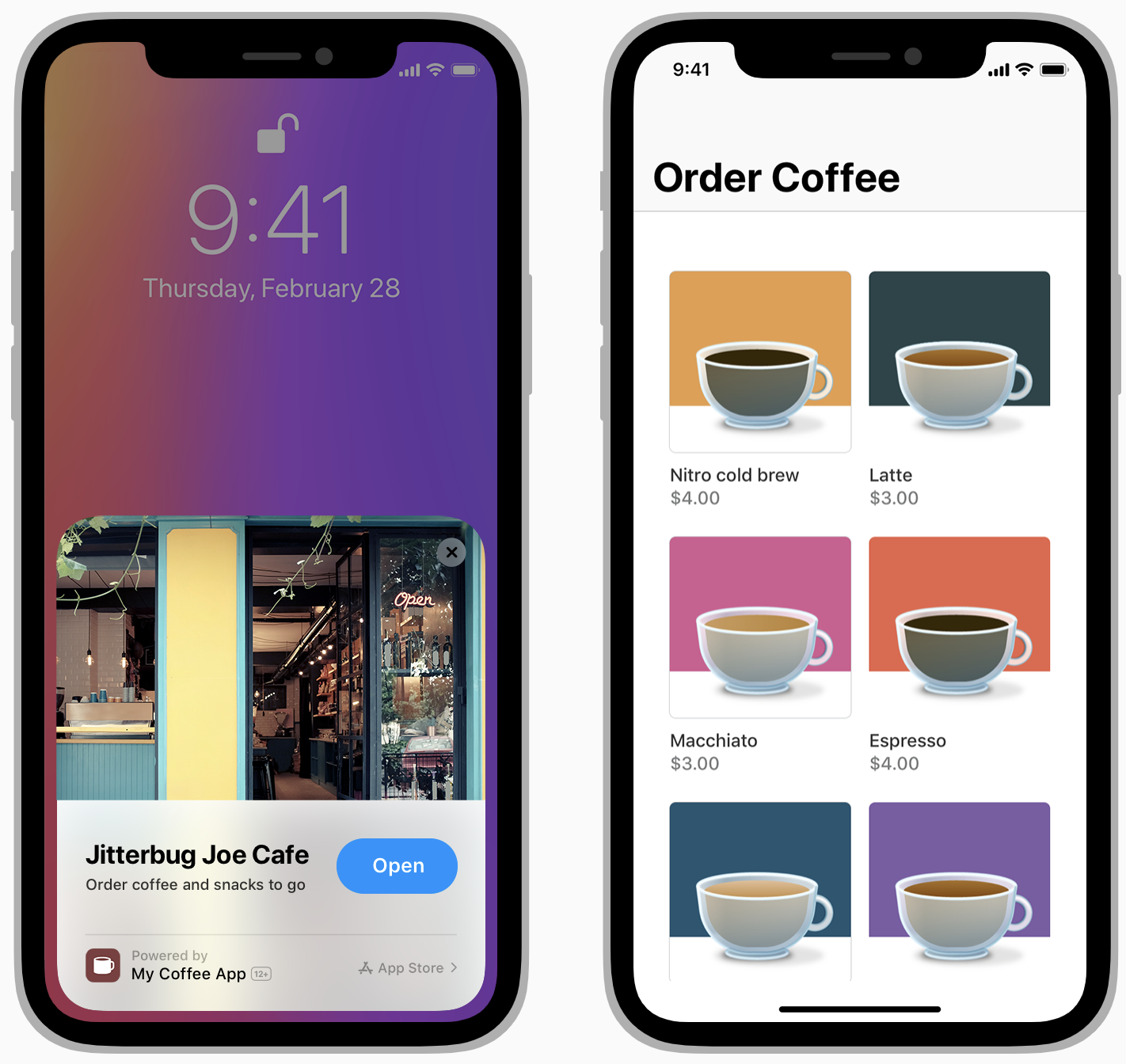 - 커피숍에서 빠른 사전 주문을 위한 앱 클립 (고객은 메시지 앱에서 웹 사이트 링크 공유 및 수신자는 메시지 내에서 앱 클립 실행 탭)