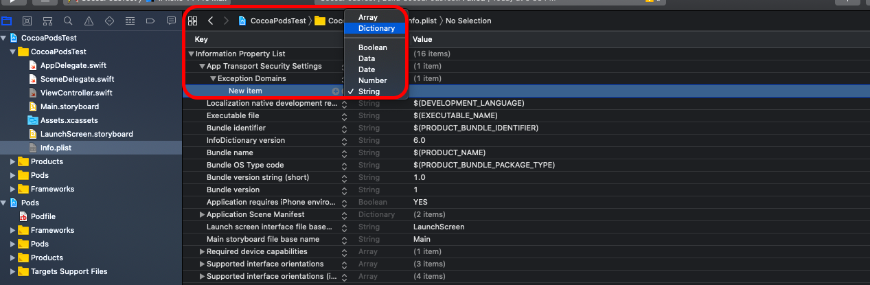 (1)App Transport Security Settings -> Exception Domains 하위 항목에 아이템 생성 후 Dictionary로 설정