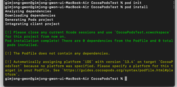 - pod전용 프로젝트 생성 : pod install