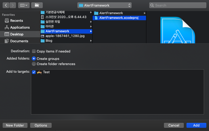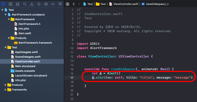 - 프로젝트 이름을 AlertFramework로 한다면, 다른 프로젝트에서 import AlertFramework로 접근함