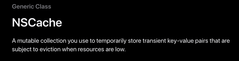 - NSCache는 자체적으로 시스템 메모리를 너무 많이 사용하지 않도록 자동으로 제거되는 정책을 소유