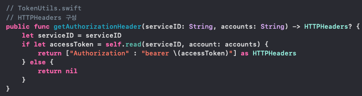 - API에서 Authorization header를 필요로 하는경우에는 Header를 만들어서 REQ를 해야하는데, 이 메소드를 만들어 놓으면 간편